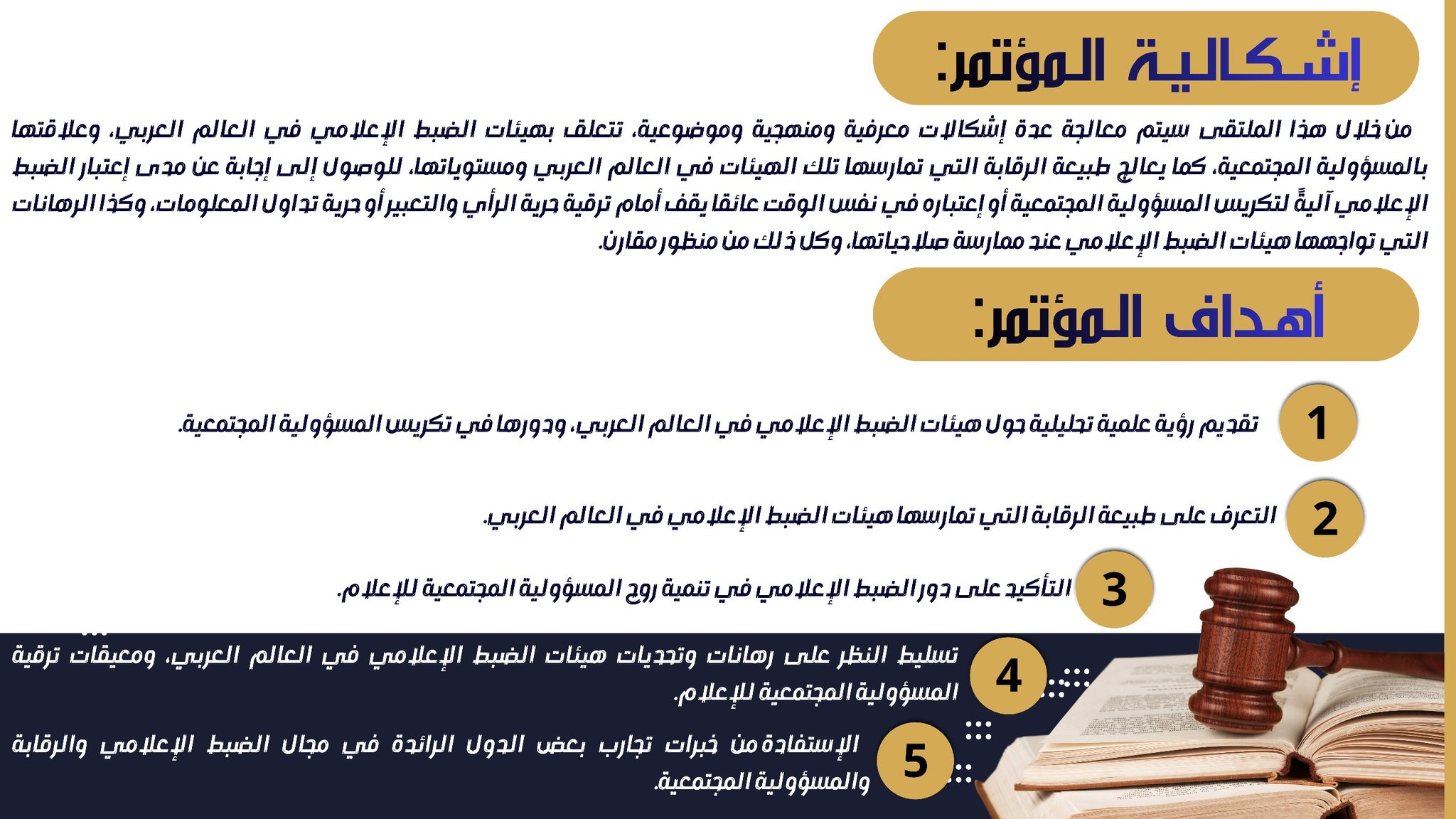 من خلال هذا الملتقى سيتم معالجة عدة إشكالات معرفية ومنهجية وموضوعية، تتعلق بهيئات الضبط الإعلامي في العالم العربي، وعلاقتها بالمسؤولية المجتمعية، كما يعالج طبيعة الرقابة التي تمارسها تلك الهيئات في العالم العربي ومستوياتها، للوصول إلى إجابة عن مدى إعتبار الضبط الإعلامي آليةً لتكريس المسؤولية المجتمعية أو إعتباره في نفس الوقت عائقا يقف أمام ترقية حرية الرأي والتعبير أو حرية تداول المعلومات، وكذا الرهانات التي تواجهها هيئات الضبط الإعلامي عند ممارسة صلاحياتها، وكل ذلك من منظور مقارن.